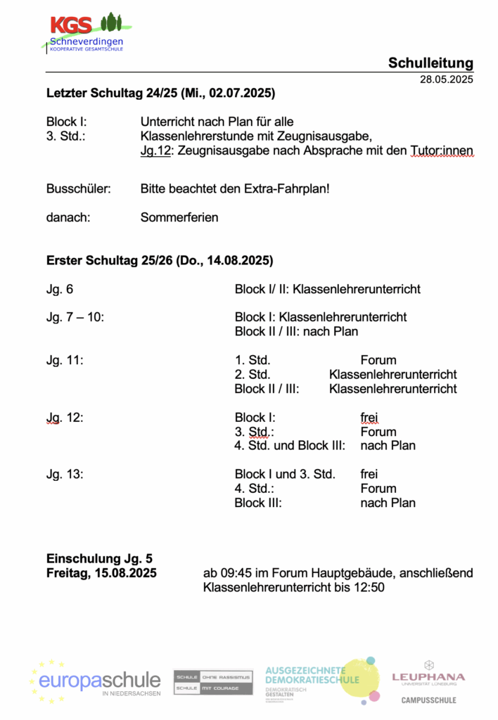 Große Ereignisse werfen ihre Schatten schon jetzt voraus. Darum hier die relevanten Informationen zum letzten Schultag des laufenden und dem ersten des kommenden Schuljahres.