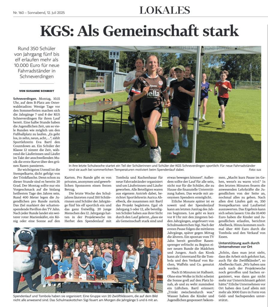 In ihrer Ausgabe vom 12. Juli 2025 berichtet die Böhme-Zeitung vom Spendenlauf der KGS